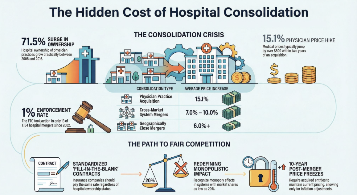 Hospital consolidation isn’t lowering costs; it’s driving them up. Hospital systems are rapidly acquiring physician practices, and the data is clear on the consequences:
